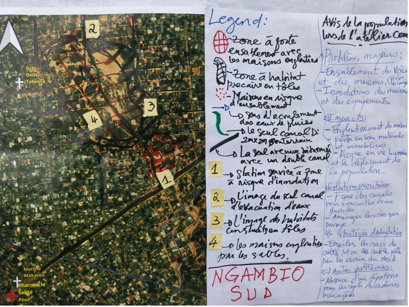 Community-map developed in Ngambio of climate risk and potential solutions. (November 2025. Photo credit: Claude Mahoungou)
