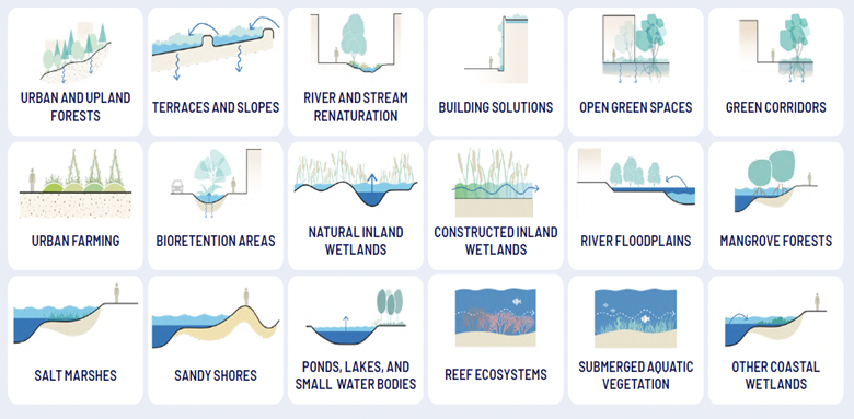 NbS is an umbrella term to define a series of “green” approaches (Figure 1) that use nature and natural processes to deliver services, infrastructure, and integrative solutions. Given the financial constraints faced by most SIDS, NbS also offer cost-effective alternatives to engineered solutions, with lower maintenance costs, or can be combined with gray infrastructure in hybrid approaches.