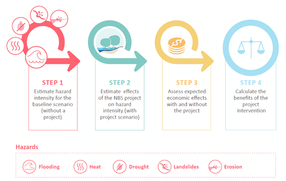 Nature-based Solutions differ significantly from traditional gray infrastructure in terms of costs: typically, lower capital expenditure but more sustained operating expenditure. Quantifying the costs and benefits of NbS is crucial for securing funding and support. This includes socio-environmental benefits such as ecotourism potential or job creation, and avoided damage costs computed by comparing the NbS project intended benefits to a without-project scenario, or where an alternative solution is chosen. The methodology used by the GPNBS provides four steps for this assessment (Figure 2).