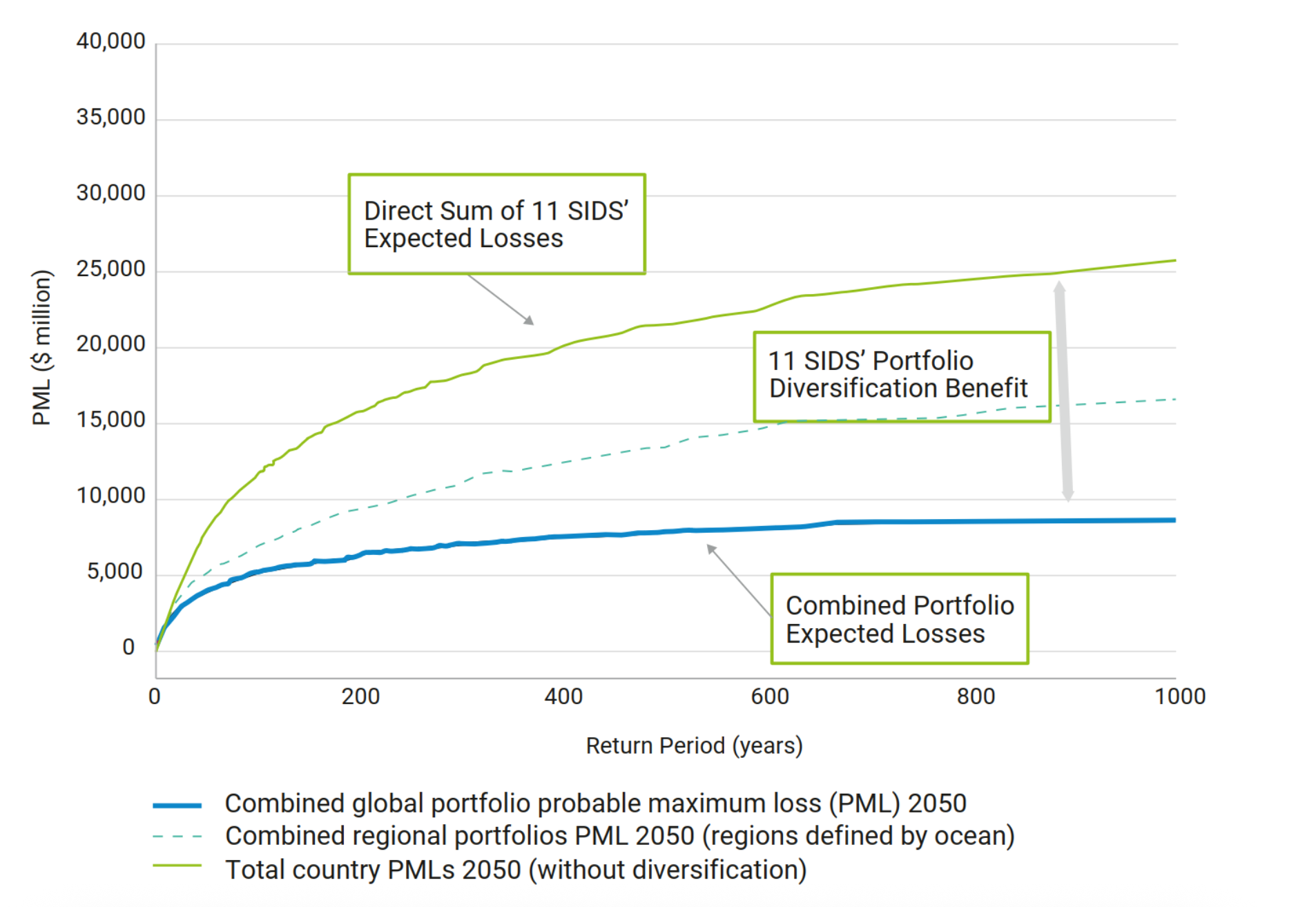 The CISL study modeled the pure premium required to protect the economies of the 11 SIDS, modeled from losses exceeding an equivalent of 10 percent of GDP. The modeling calculates the total uninsured annual Probable Maximum Loss (PML) for each of the 11 countries at 0.1 percent annual probability (or a 1-in-1000-year event). The total amount is about $25 billion. A joint umbrella insurance mechanism for all 11 countries for this level of protection would require $314 million per year.