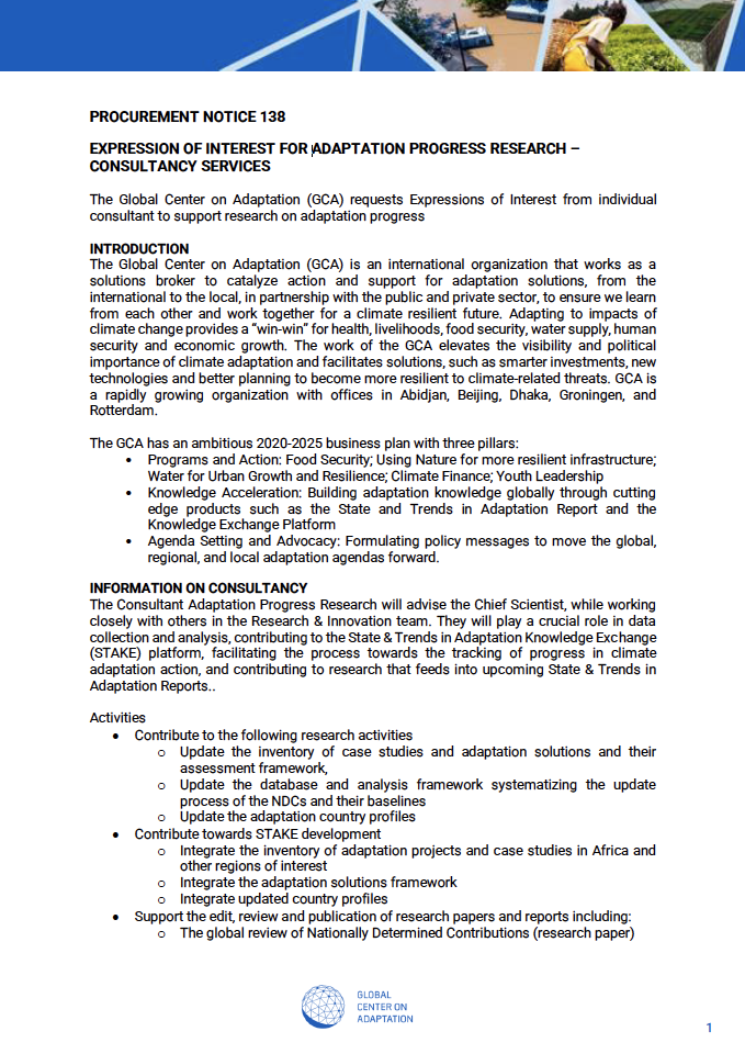 The Global Center on Adaptation (GCA) requests Expressions of Interest from individual consultants to support research on adaptation progress.
