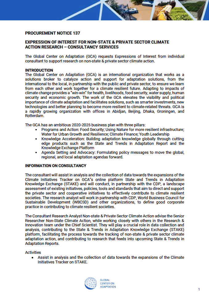 The Global Center on Adaptation (GCA) requests Expressions of Interest from individual consultant to support research on non-state & private sector climate action.