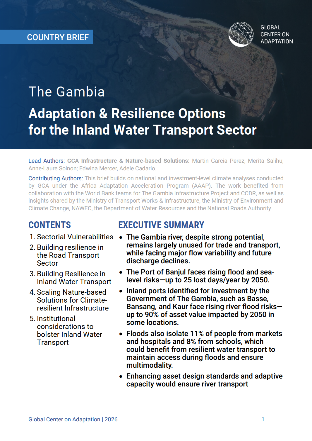 The Adaptation and Resilience Options for the Inland Water Transport Sector country brief explores opportunities to unlock the potential of the Gambia River as a resilient transport corridor. It assesses climate risks to riverine infrastructure and navigation conditions, and proposes strategies to improve multimodal connectivity, strengthen port resilience, and support adaptive planning for future inland transport development.