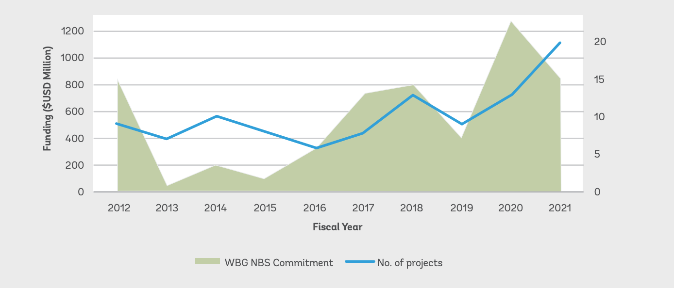 Figure 1. Approved World Bank Group (WBG) projects with NbS for climate resilience and cumulative approved WBG commitment for NbS from FY12 to FY21