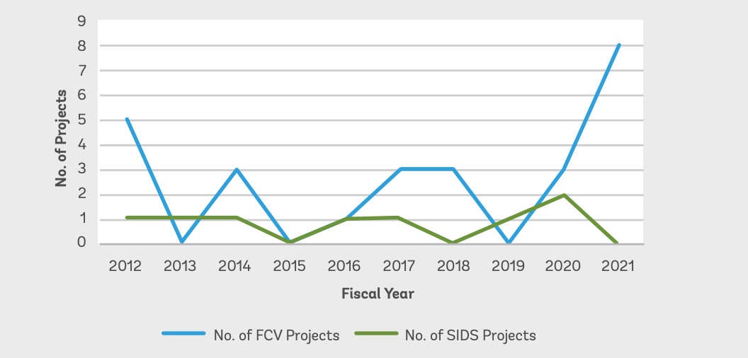 Figure 2. Number of NbS for climate resilience projects in SIDS and FCV (countries affected by fragility, conflict, and violence) context approved by the World Bank from FY12 to FY21 period